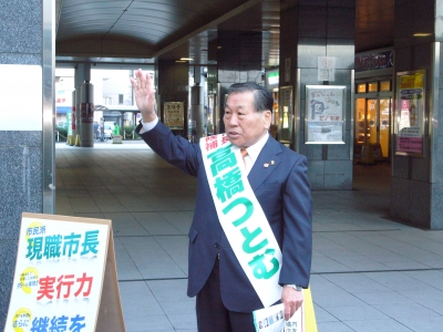 (高橋つとむ現職市長(候補者)です。朝の様子と夜の様子です)