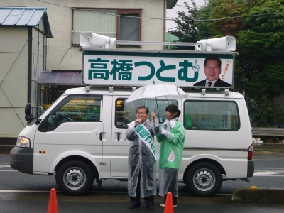 雨の中高橋努(現職市長)候補者も必死に声を出していましたよ!