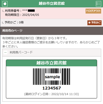 「利用者のページ」にログインすることで利用券のバーコードを