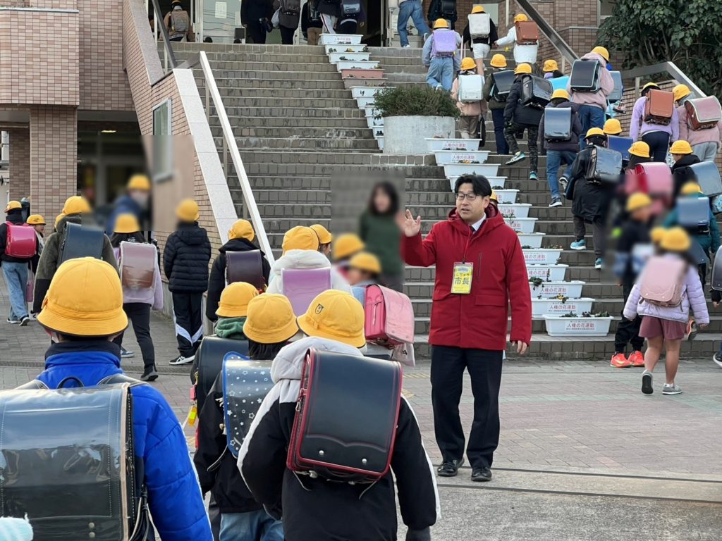 各小学校の生徒に朝の挨拶と同時に、