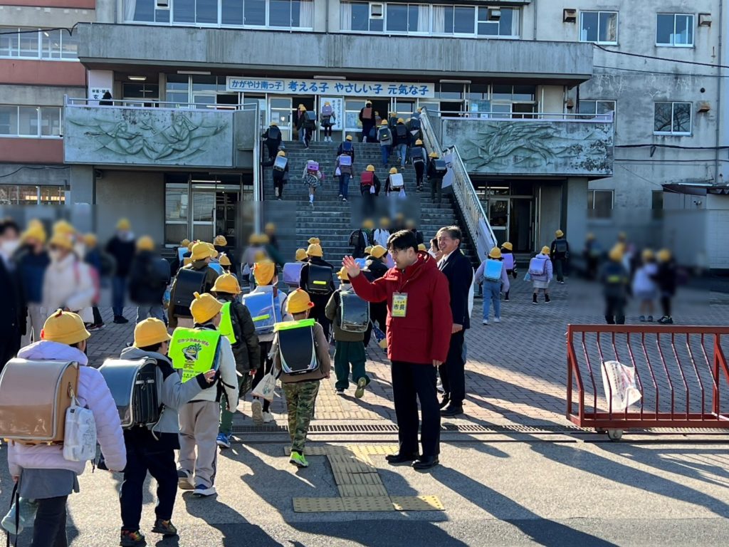 各小学校の児童に朝の挨拶と同時に