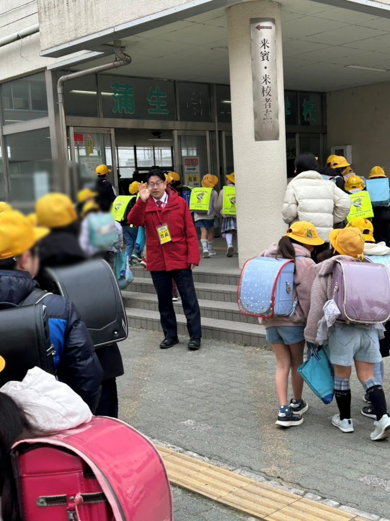 本日、教育長とともに、 蒲生小学校の交通安全運動を