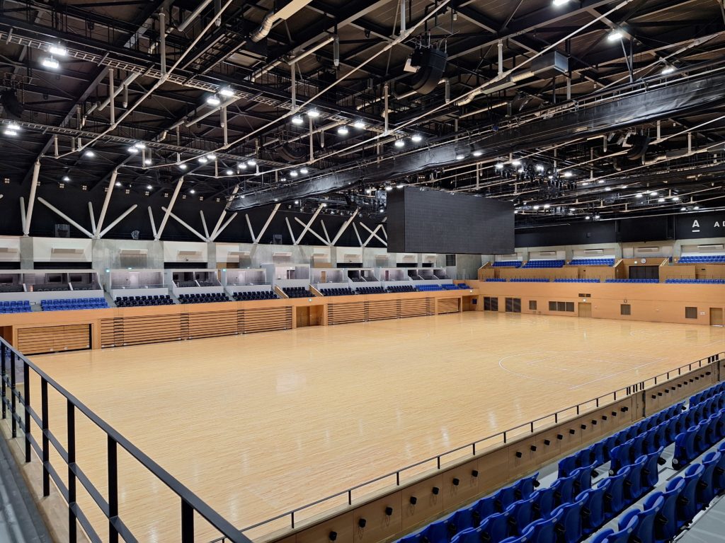 (職員さんが 茨城ロボッツの青 越谷アルファ―ズの赤で