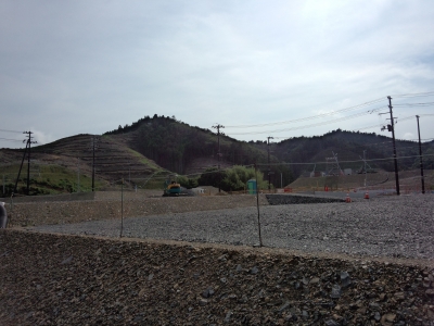 (山を切り崩して、復興のための開発を実施しています)
