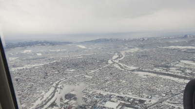(飛行機からの旭川の写真です。雪で覆われています。)