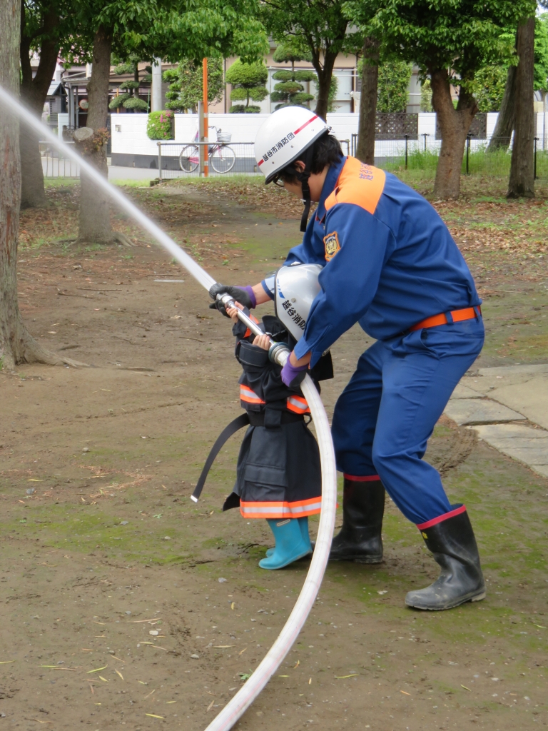 (子どもによる放水体験です。将来消防団に入ってくれるかな?)