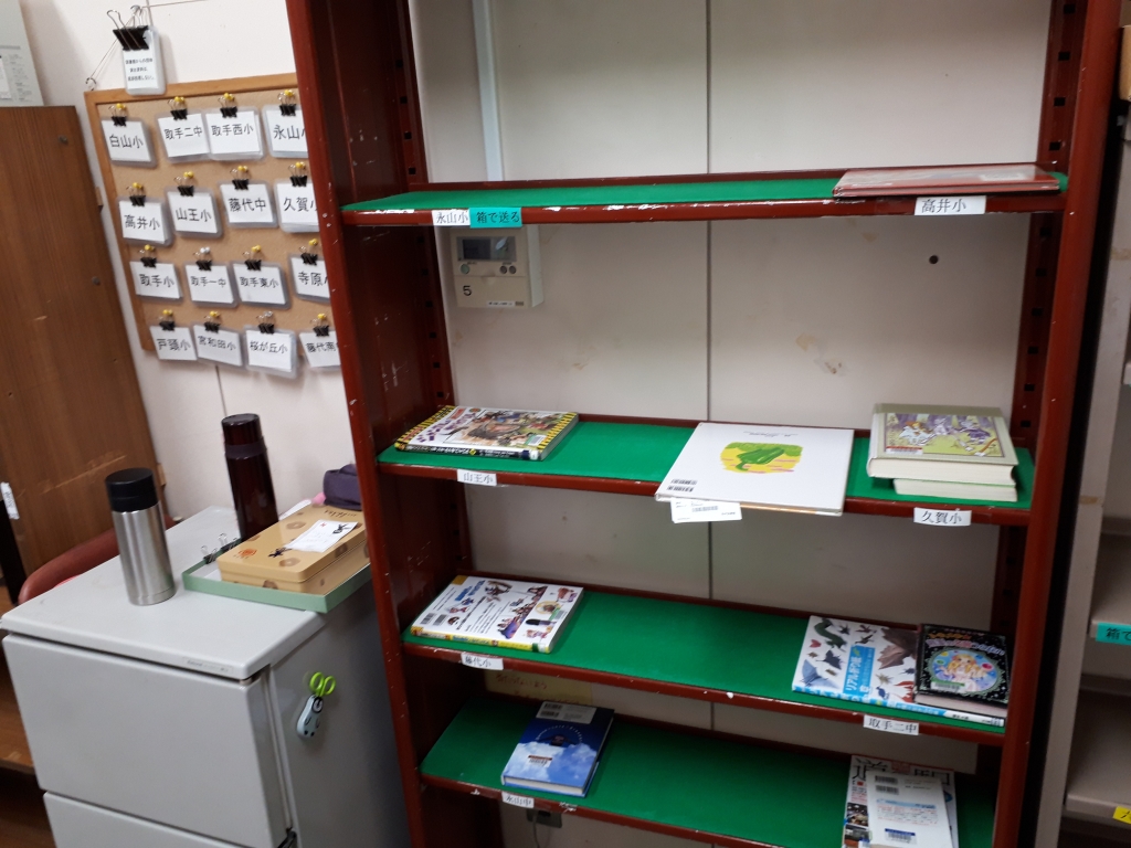 (図書館における学校ごとの仕分けの様子です)