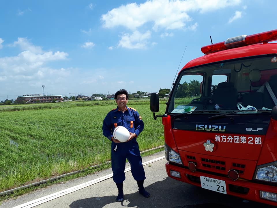 (ポンプ車操法の練習終了後に撮りました。暑かったです)