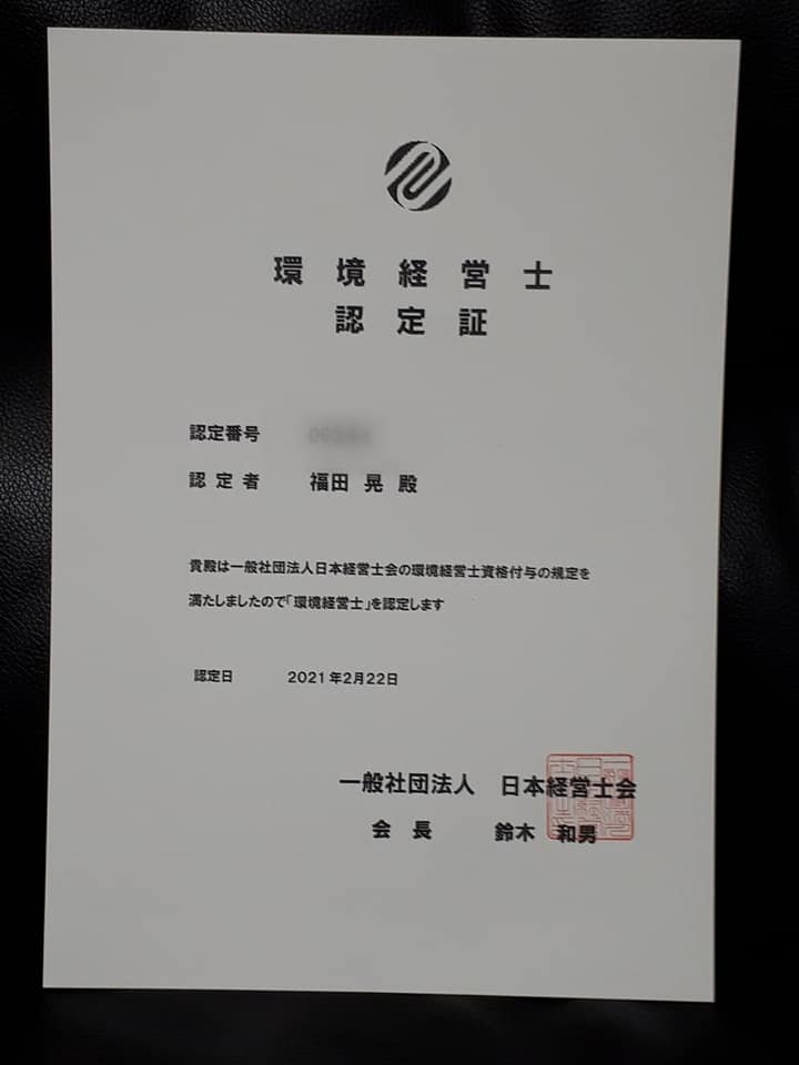 本日、環境経営士の認定書が家に届きました。