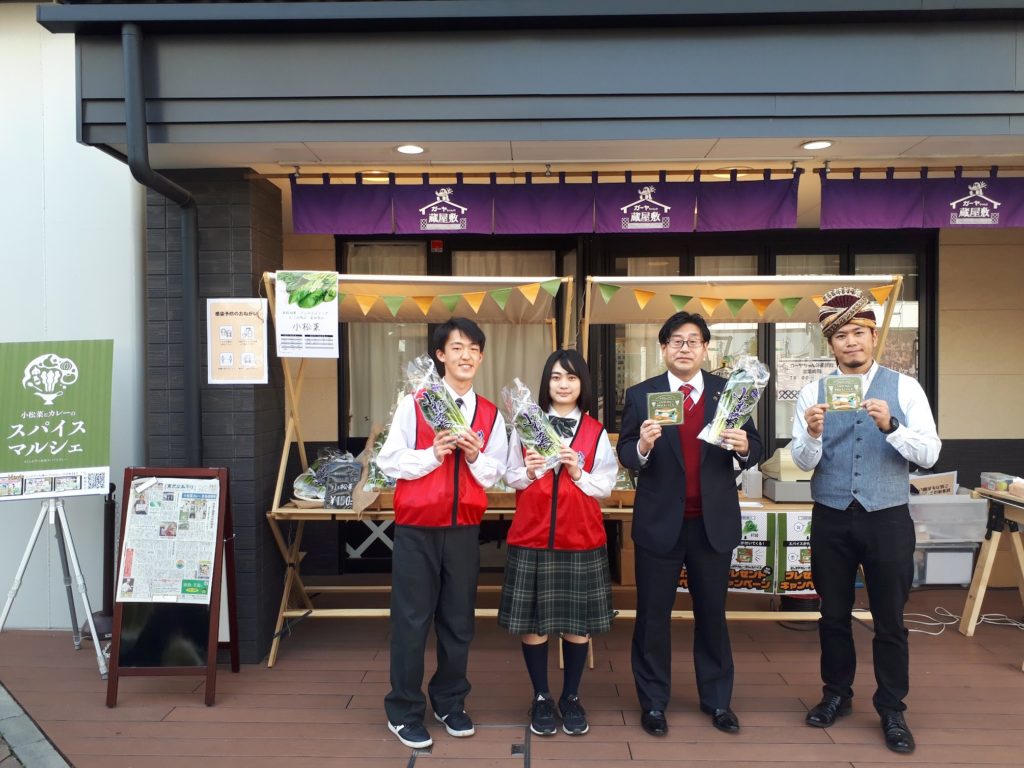 こしがやカレーMIXスパイスと小松菜の販売があり